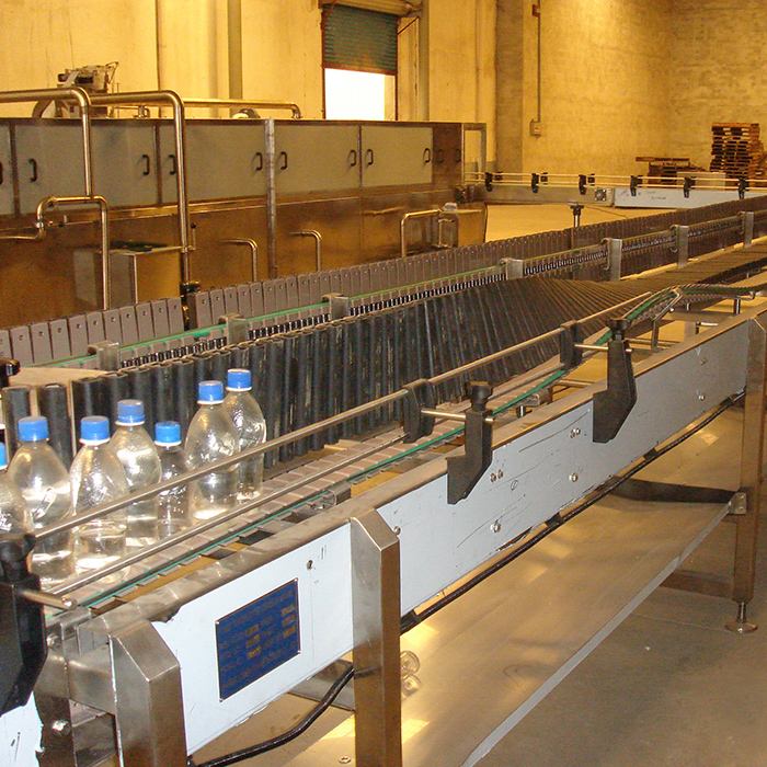 Air delivery in-feeding conveyor and connect with star wheel directly to make bottle size change easily.